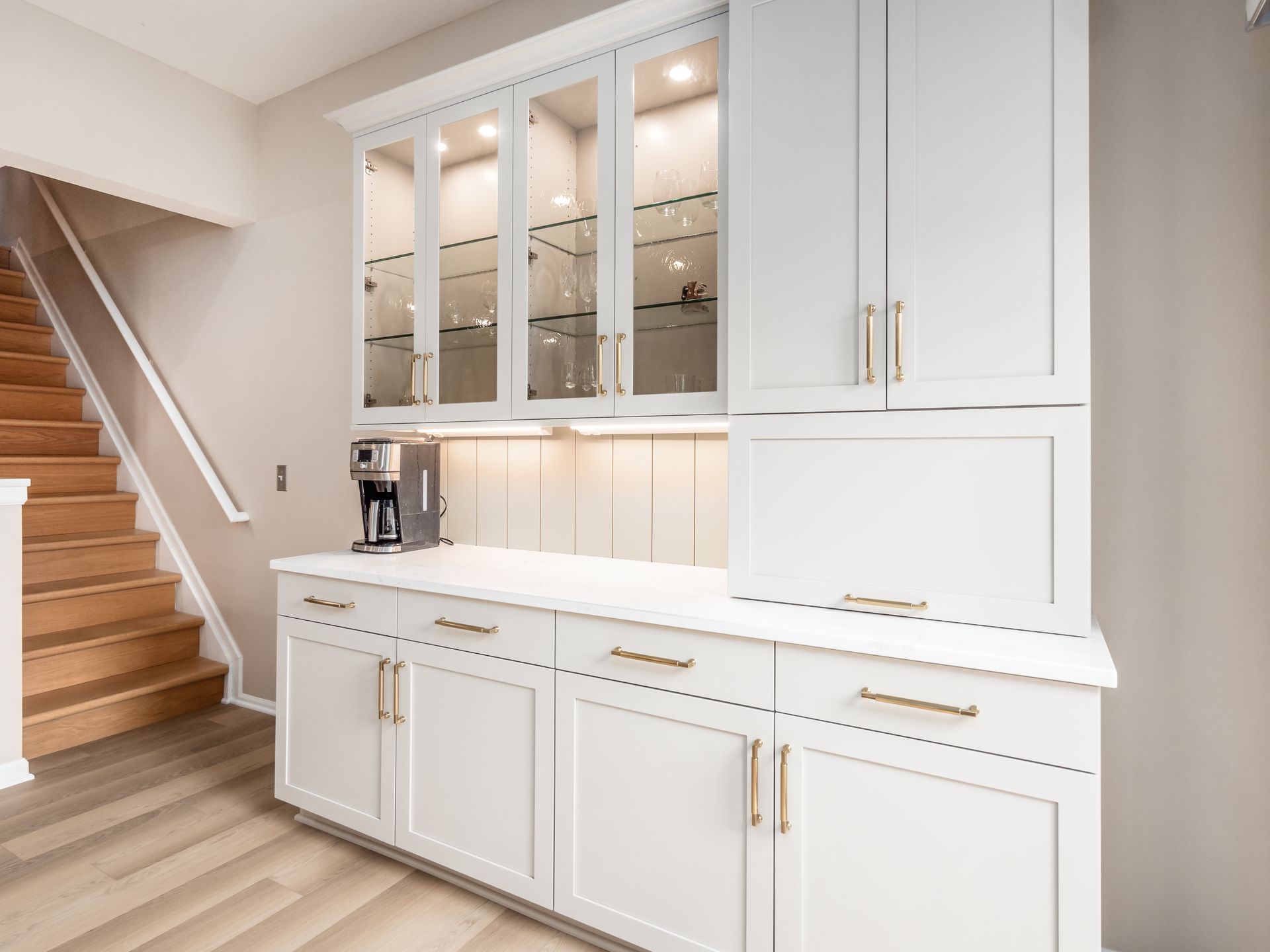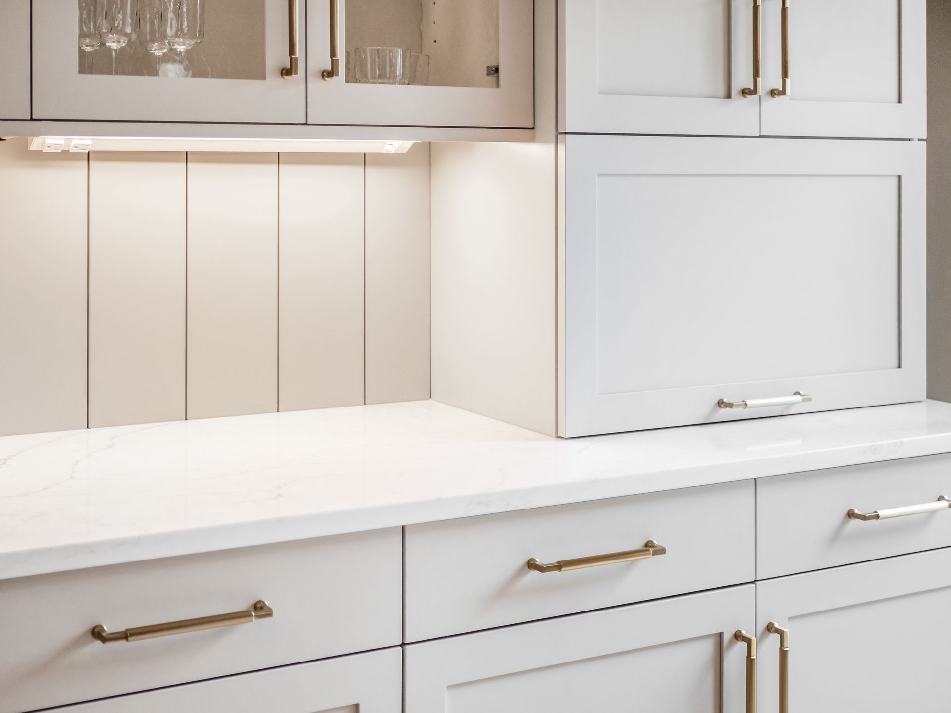 The countertops are a showstopper — quartz surfaces with the elegant look of Calacatta marble, delivering the beauty of natural stone with added durability and ease of maintenance. Other standout features include: