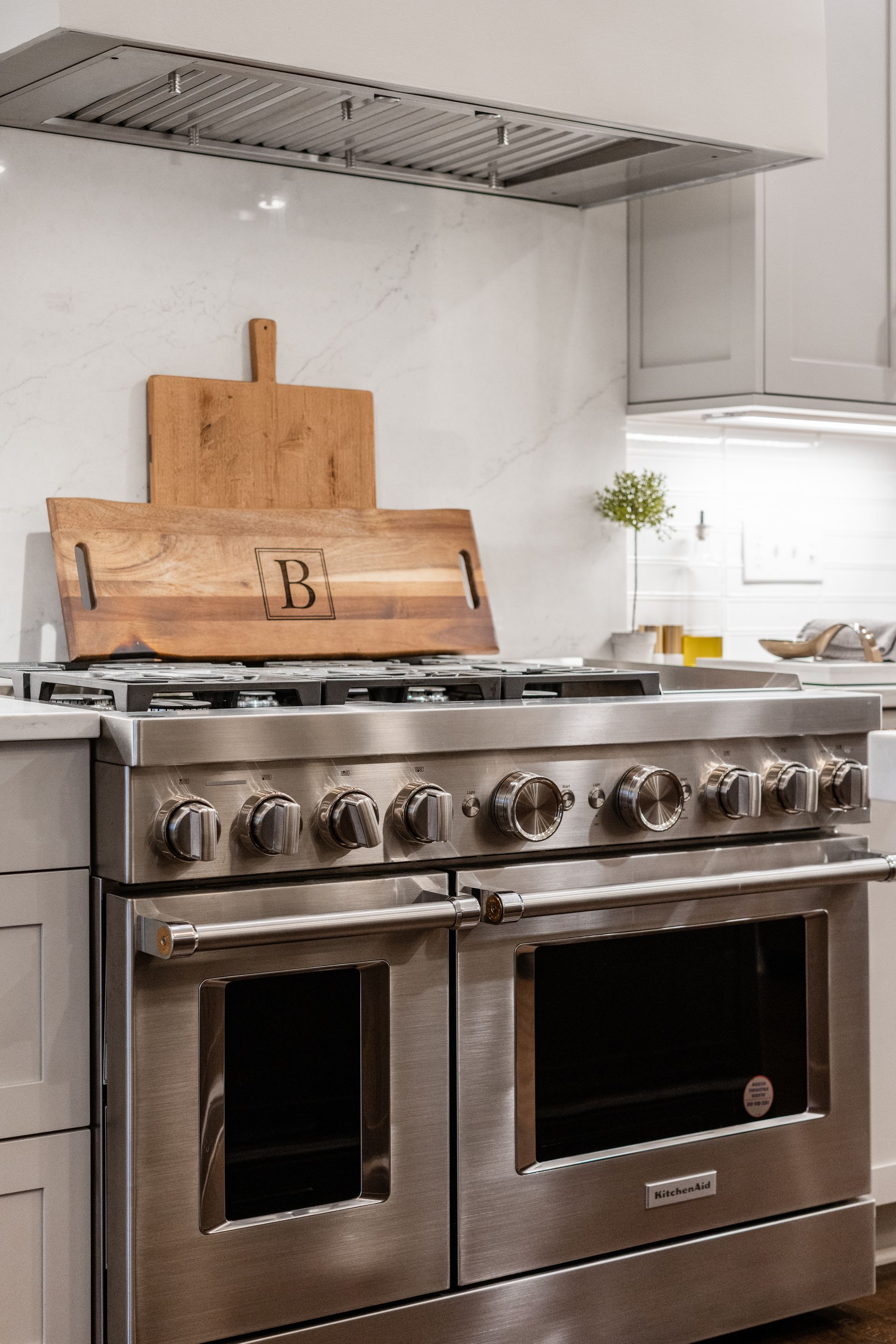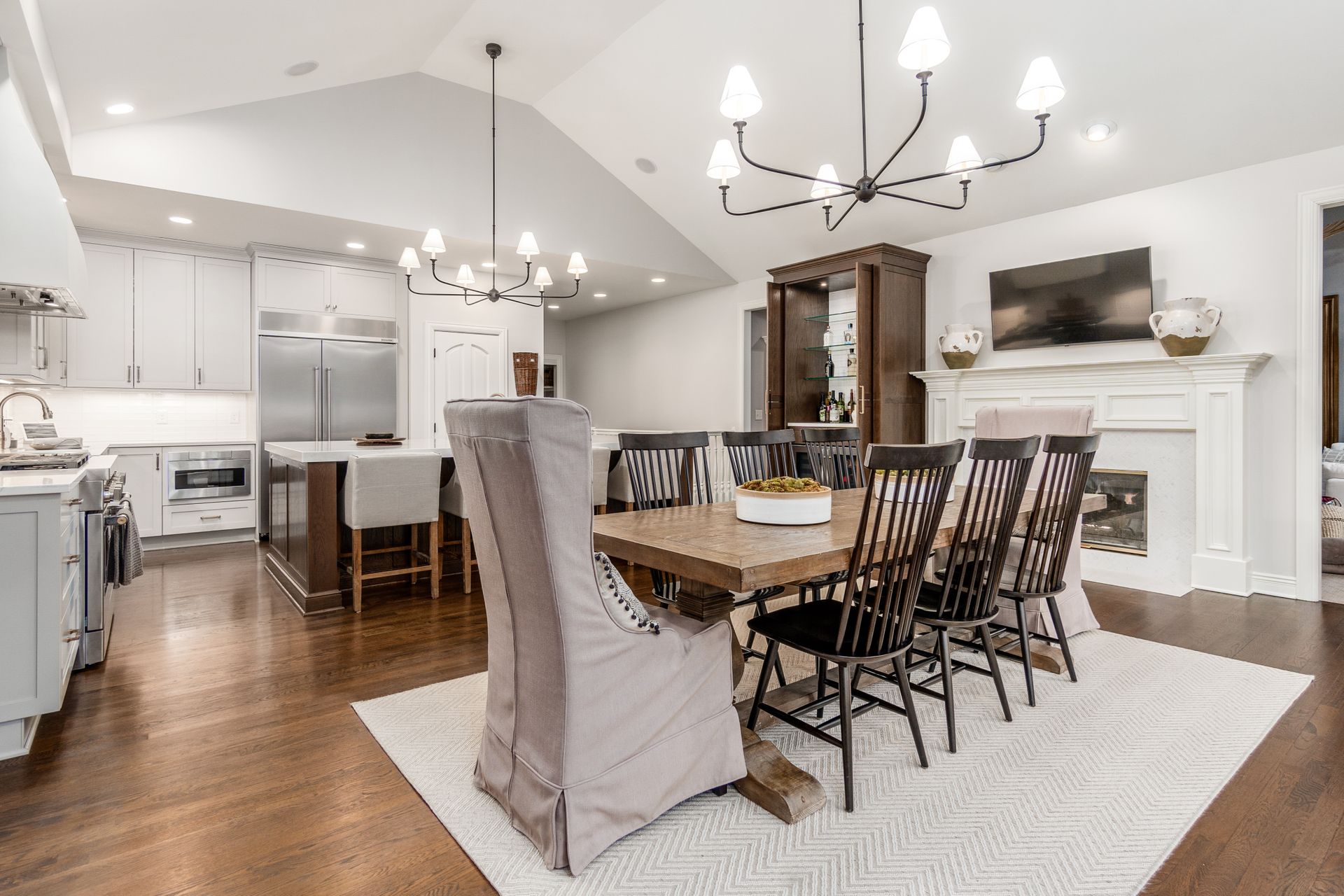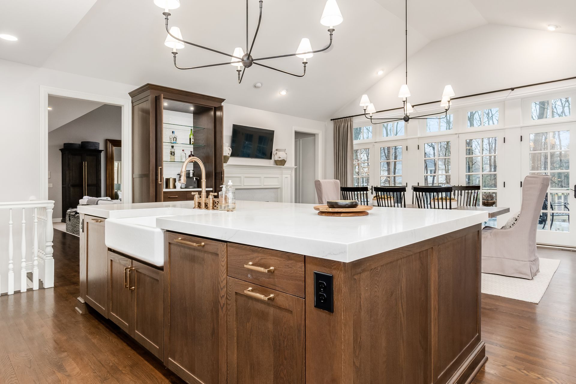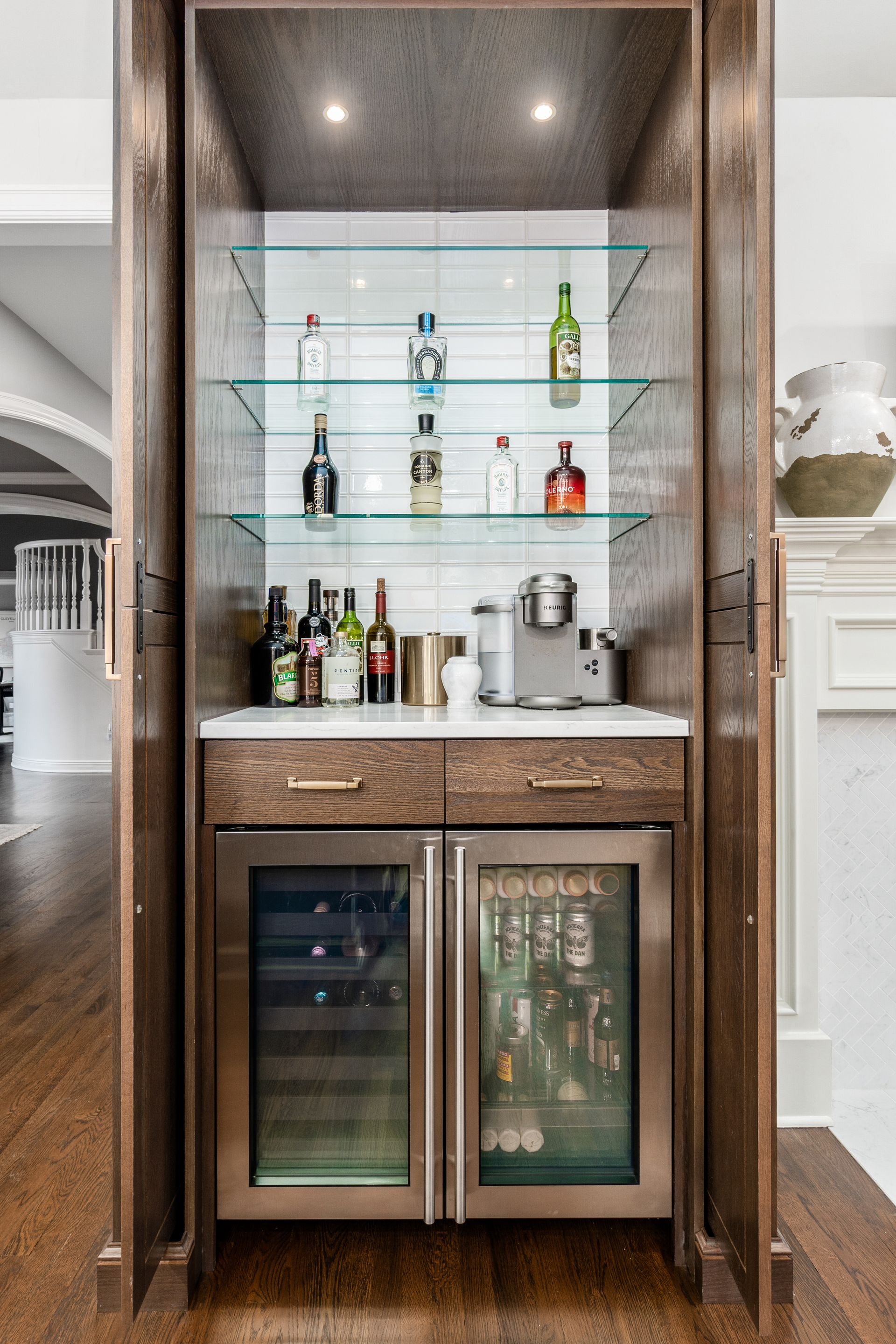 This kitchen remodel features a stunning blend of custom craftsmanship and modern design. We created beautiful, custom cabinetry that perfectly fits the space while providing ample storage and seamless functionality. One of the standout features is a hidden bar area, cleverly tucked away to maintain the kitchen’s clean, open feel while offering a private space for entertaining. The 10 foot island, topped with exquisite 6cm quartz counter tops, serves as both a statement piece and a highly functional work surface for cooking and gathering. To complete the look, a custom range hood was designed and made from plaster, adding a touch of elegance and balance to the space. The result is a kitchen that’s both beautiful and practical, perfectly tailored to the client’s needs and style.